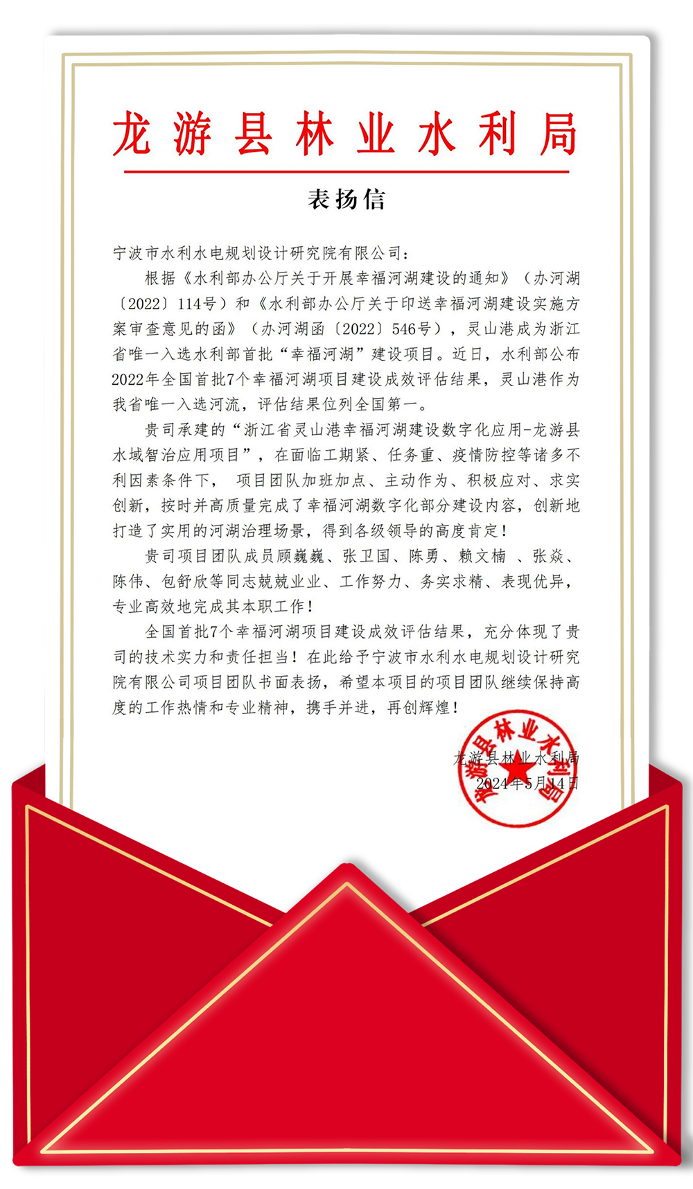 發(fā)布日期:2024.06.05 ? ? ? ?近日,我院收到一封來自業(yè)主單位衢州市龍游縣林業(yè)水利局的表揚信。信中提到:我院在承建“浙江省靈山港幸福河湖建設(shè)數(shù)字化應(yīng)用-龍游縣水域智治應(yīng)用項目”的過...