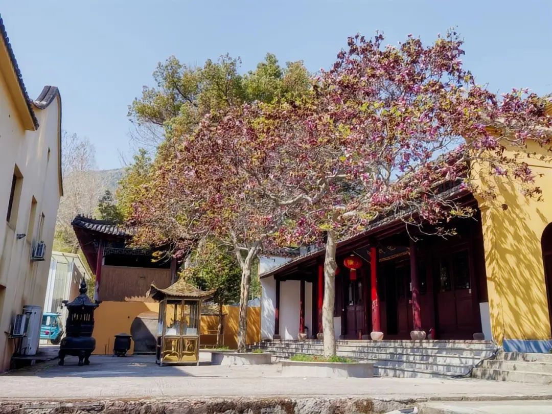 早上8:45,大巴準(zhǔn)時(shí)從園區(qū)啟程,在陽光明媚中駛向?qū)幉ㄏ笊綁︻^鎮(zhèn)舫前村。抵達(dá)智門禪寺時(shí),茶園環(huán)繞,竹海綿延,百年紫玉蘭正值花期。大家或駐足欣賞古剎花影,或在禪寺咖啡館品鑒特色飲品,于傳統(tǒng)與現(xiàn)代交融中開啟這一天的芳菲之旅。