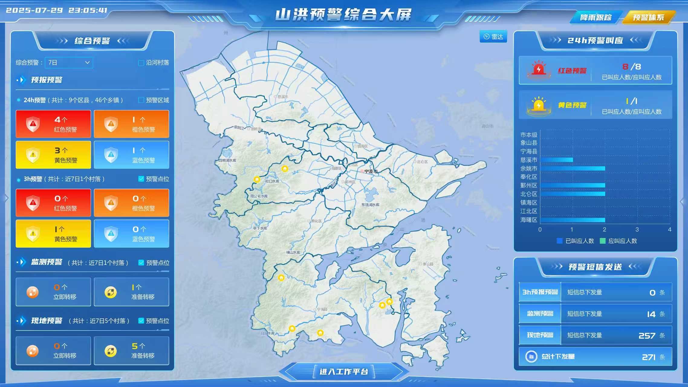 山洪災(zāi)害突發(fā)性強(qiáng)、破壞力大。該平臺(tái)聚焦山洪防御業(yè)務(wù)流程,以氣象部門網(wǎng)格化預(yù)報(bào)降雨為基礎(chǔ),依托精細(xì)化山洪預(yù)報(bào)預(yù)警模型,滾動(dòng)分析全市山洪風(fēng)險(xiǎn)形勢,并及時(shí)向相關(guān)責(zé)任人和社會(huì)公眾發(fā)送提醒短信,實(shí)現(xiàn)快速研判和及時(shí)提醒。