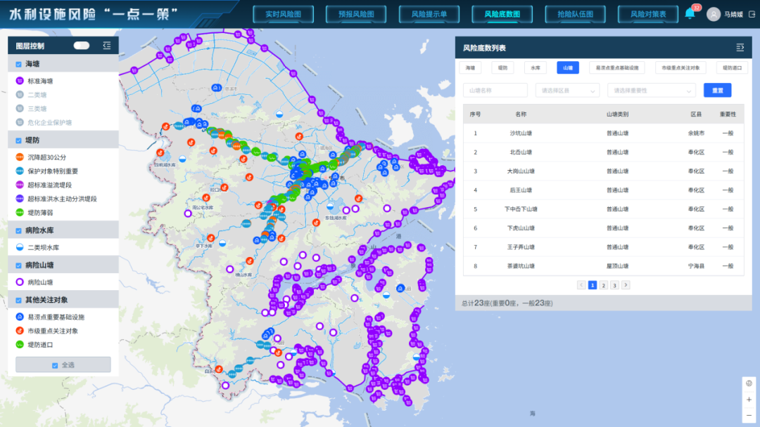 防汛抗洪,首先要摸清風(fēng)險(xiǎn)底數(shù)。每年汛前,該系統(tǒng)定期維護(hù)水庫、山塘、堤防、海塘等水利設(shè)施及搶險(xiǎn)救援信息,為風(fēng)險(xiǎn)預(yù)報(bào)預(yù)警提供基礎(chǔ)底數(shù)。調(diào)用水利設(shè)施風(fēng)險(xiǎn)研判模型,通過實(shí)時(shí)研判和創(chuàng)建預(yù)報(bào)方案計(jì)算,展示可能產(chǎn)生風(fēng)險(xiǎn)的水利設(shè)施、風(fēng)險(xiǎn)等級及相應(yīng)對策措施,形成風(fēng)險(xiǎn)提示單和預(yù)報(bào)風(fēng)險(xiǎn)圖,為搶險(xiǎn)救援提供精準(zhǔn)支撐。