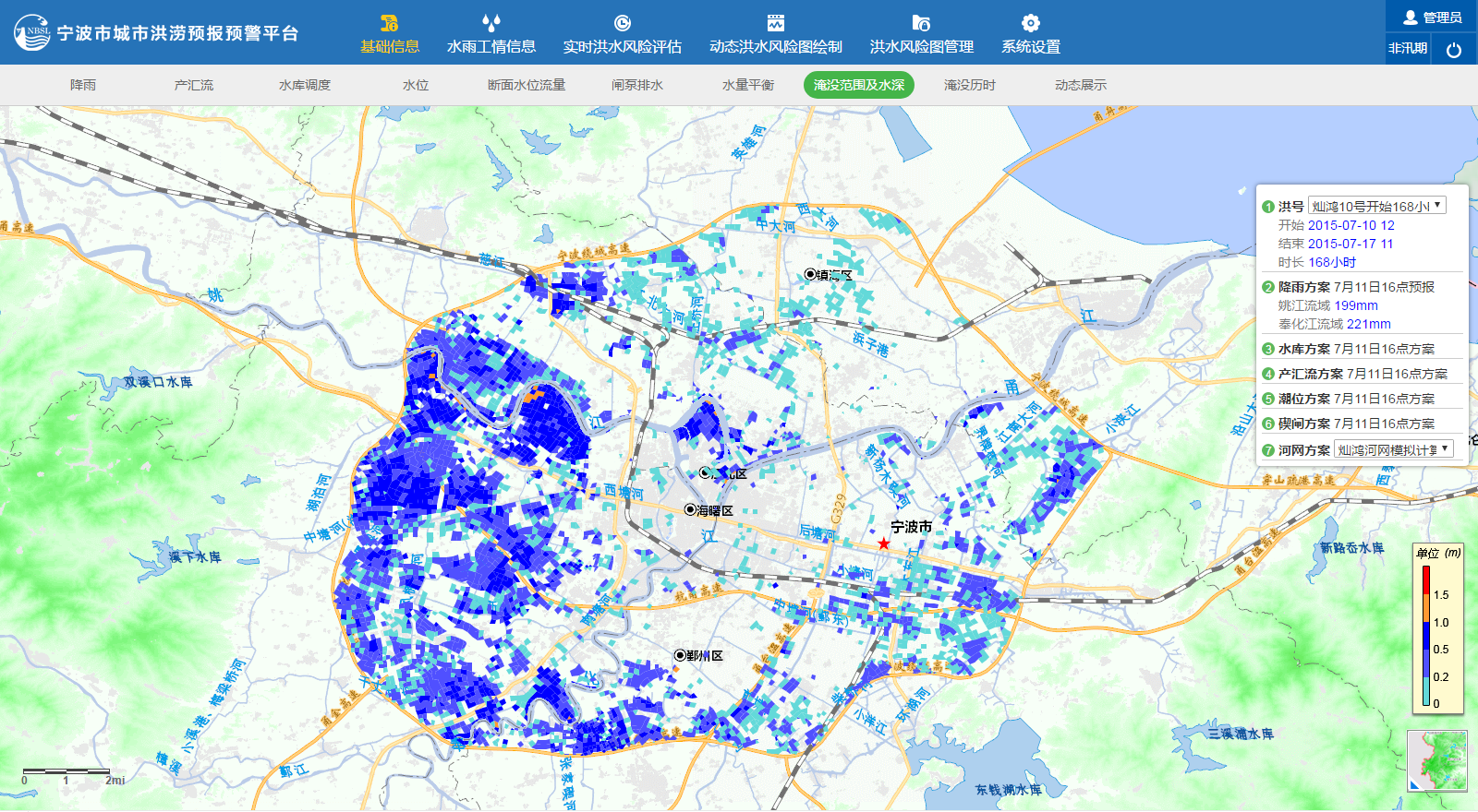 圍繞城市防汛工作的特點,通過構(gòu)建城市洪澇計算及風(fēng)險分析數(shù)學(xué)模型,結(jié)合物聯(lián)網(wǎng)、大數(shù)據(jù)、人工智能等技術(shù),能夠提前6~12小時預(yù)判洪澇災(zāi)害的發(fā)生區(qū)域、時間和風(fēng)險程度,實現(xiàn)對洪澇災(zāi)害“預(yù)報預(yù)警、未雨綢繆、主動應(yīng)對、減災(zāi)減損”。