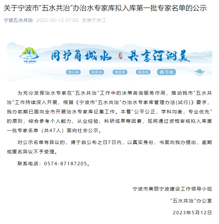 為充分發(fā)揮治水專家在“五水共治”工作中的決策咨詢服務(wù)作用,推動(dòng)我市“五水共治”工作持續(xù)深入開(kāi)展,根據(jù)《寧波市“五水共治”辦治水專家?guī)旃芾磙k法(試行)》要求,寧波市美麗寧波建設(shè)工作領(lǐng)導(dǎo)小組“五水共治”辦公室前期已面向全市開(kāi)展治水專家?guī)煺骷ぷ鳌?/span>