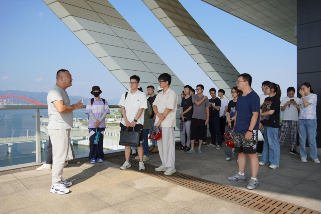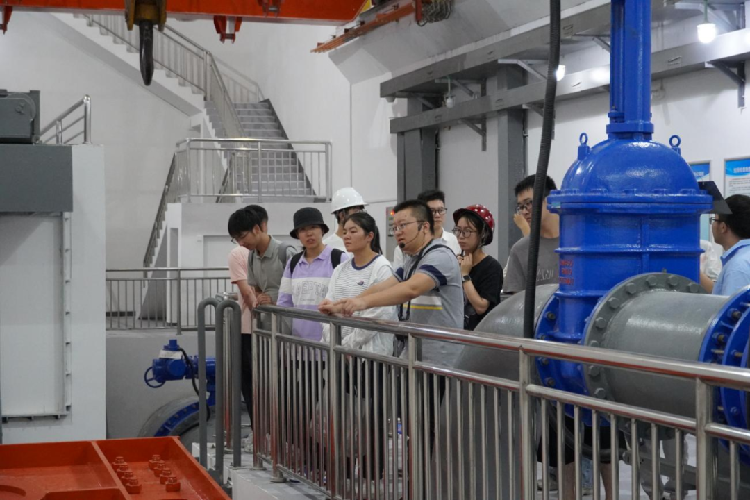 最后,研學(xué)隊(duì)伍來到北堤樞紐參觀。該工程榮獲中國建筑行業(yè)工程質(zhì)量的最高榮譽(yù)獎(jiǎng)——2020-2021年度第一批中國建設(shè)工程魯班獎(jiǎng)。胡經(jīng)理帶領(lǐng)研學(xué)隊(duì)伍依次進(jìn)入啟閉機(jī)房、觀景臺、控制室等處,現(xiàn)場講解工程設(shè)計(jì)思路、建造工藝和管理要點(diǎn)。