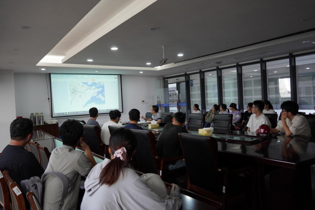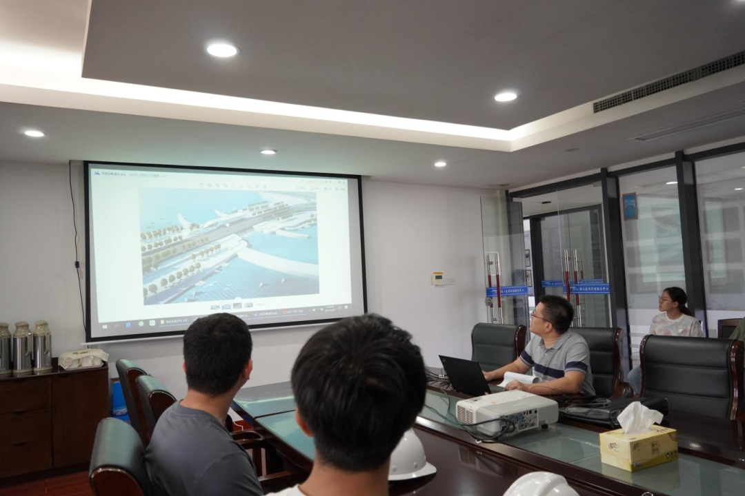 接著,研學(xué)隊(duì)伍來到會議室,胡經(jīng)理結(jié)合建設(shè)目標(biāo)、工程建設(shè)客觀因素、工程效益和景觀效果,詳細(xì)講解設(shè)計(jì)思路、問題對策和創(chuàng)新點(diǎn),為大家上了一堂嚴(yán)謹(jǐn)生動(dòng)的復(fù)盤課。比如海堤采用緩坡入海,外側(cè)采用異形結(jié)構(gòu)塊消浪,內(nèi)坡采用生態(tài)水工磚美化,使海堤具備結(jié)構(gòu)和生態(tài)景觀雙重效果;船閘與海堤銜接段軟土處理采用新型技術(shù)應(yīng)用——樁網(wǎng)復(fù)合地基,形成“樁-網(wǎng)-土”協(xié)同工作共同承載的復(fù)合工藝。在座職工認(rèn)真聆聽梅山灣如何從曾經(jīng)的“漲潮黃沙水,落潮滿目泥”到如今的“水清、岸綠、波寧、潮平”,受益匪淺。